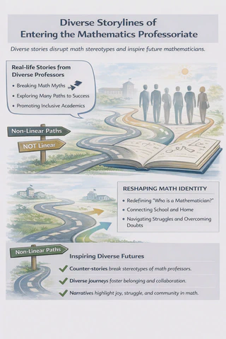 Counterstories can serve an important role in disrupting stereotypes in mathematics. In this study, we examine a set of diverse narratives crafted by eight mathematicians to share with undergraduate students. We found these narratives provided alternatives to the dominant storyline that mathematicians’ career paths are linear and stem from an uninterrupted interest and success in mathematics. By presenting different ways of engaging with mathematics and entering the professoriate, these stories further disrupt dominant narratives of individualism, innate ability, and dehumanized mathematics. The stories emphasized joy in community and collaboration, renegotiating mathematical identity when encountering struggles, and bridging school and home life. These stories contribute to our understanding of basic narrative arcs and the ways mathematicians present their stories to inspire students.